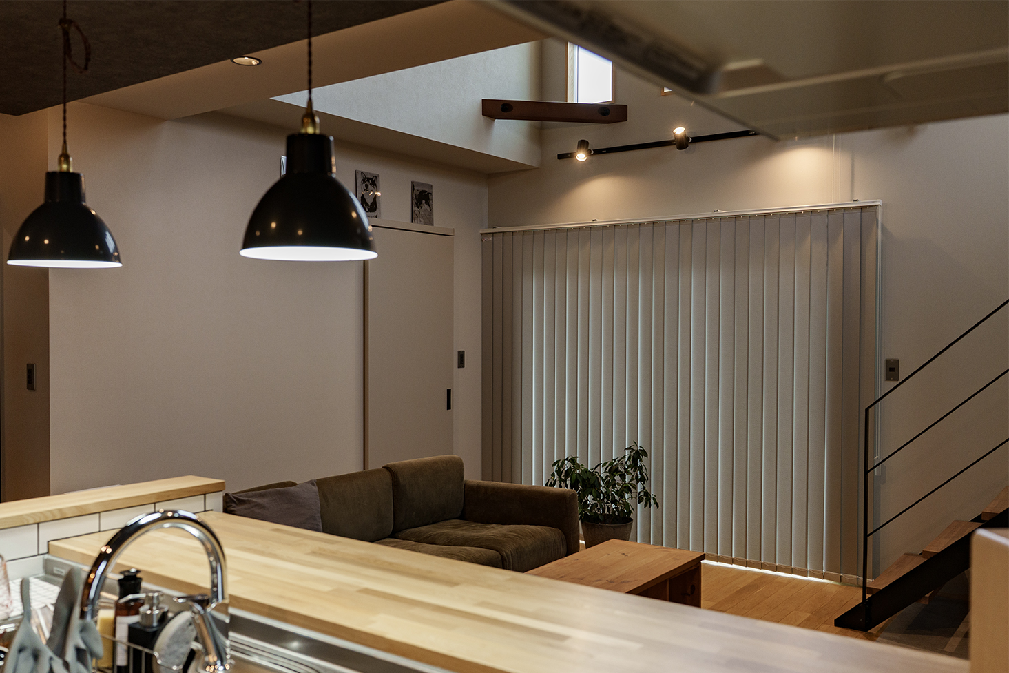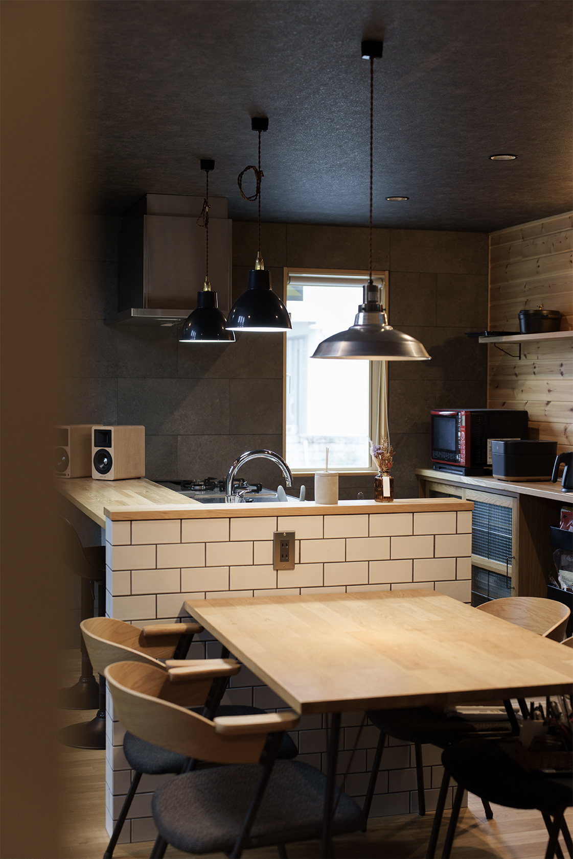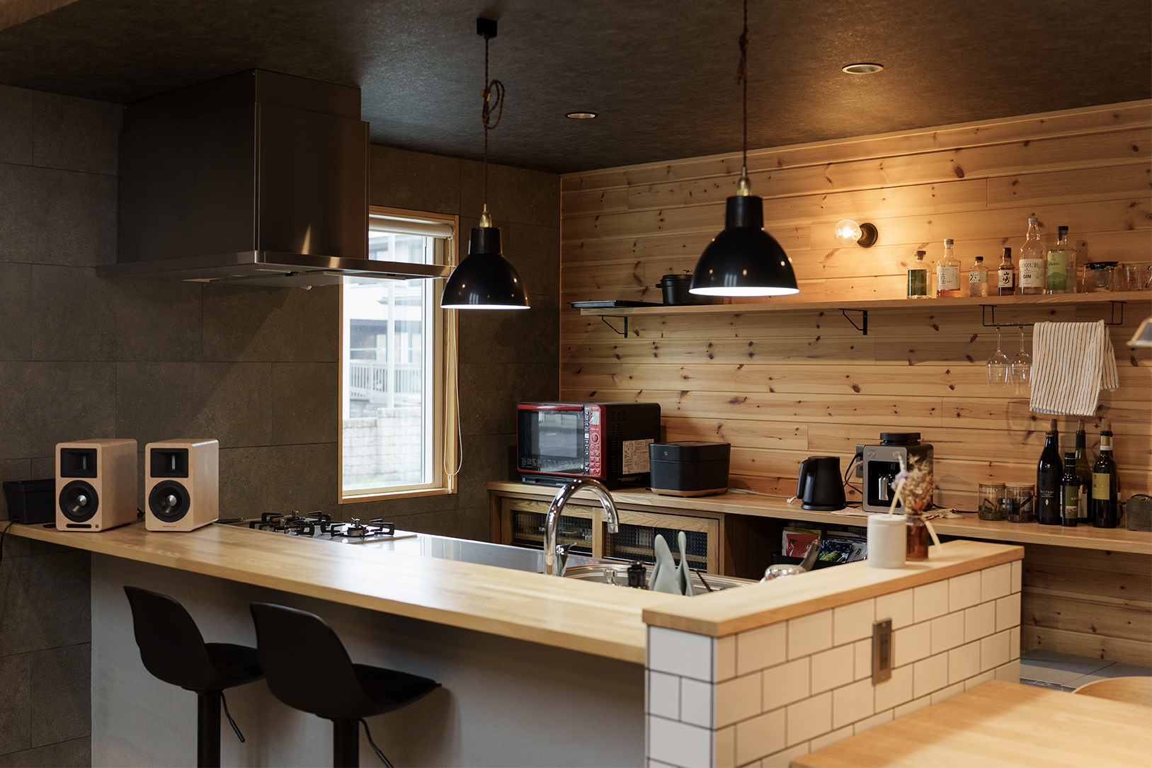 夜にはやわらかな間接照明の下で、お酒や音楽を楽しめる心地よい空間に。